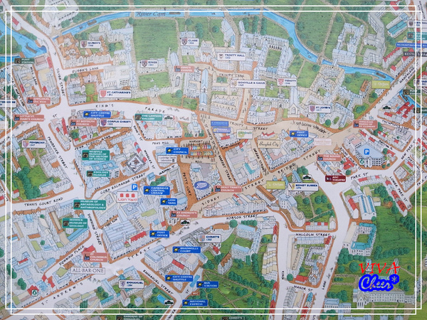 劍橋的地圖和牛津也很像,一棟棟的學院錯落在路邊,